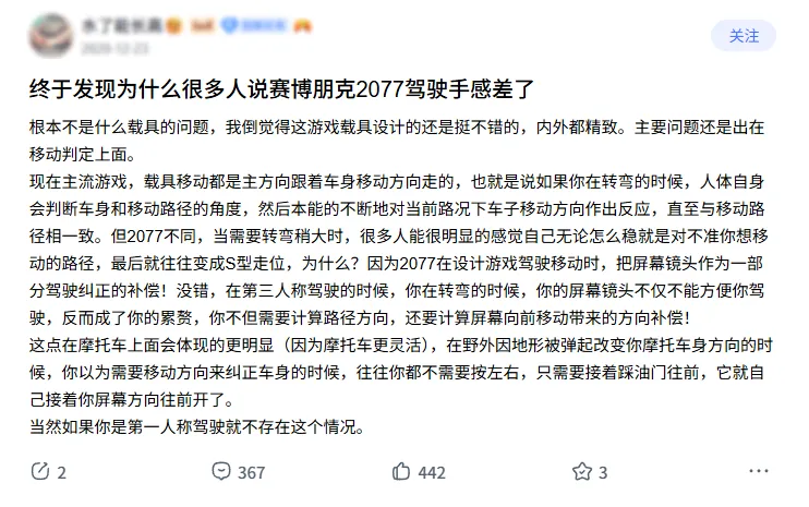 但如何把駕駛手感調校的更好,就是一個非常困難的事情,哪怕是像CDPR這種團隊,在《賽博朋克:2077》的駕駛體驗上也會翻車。