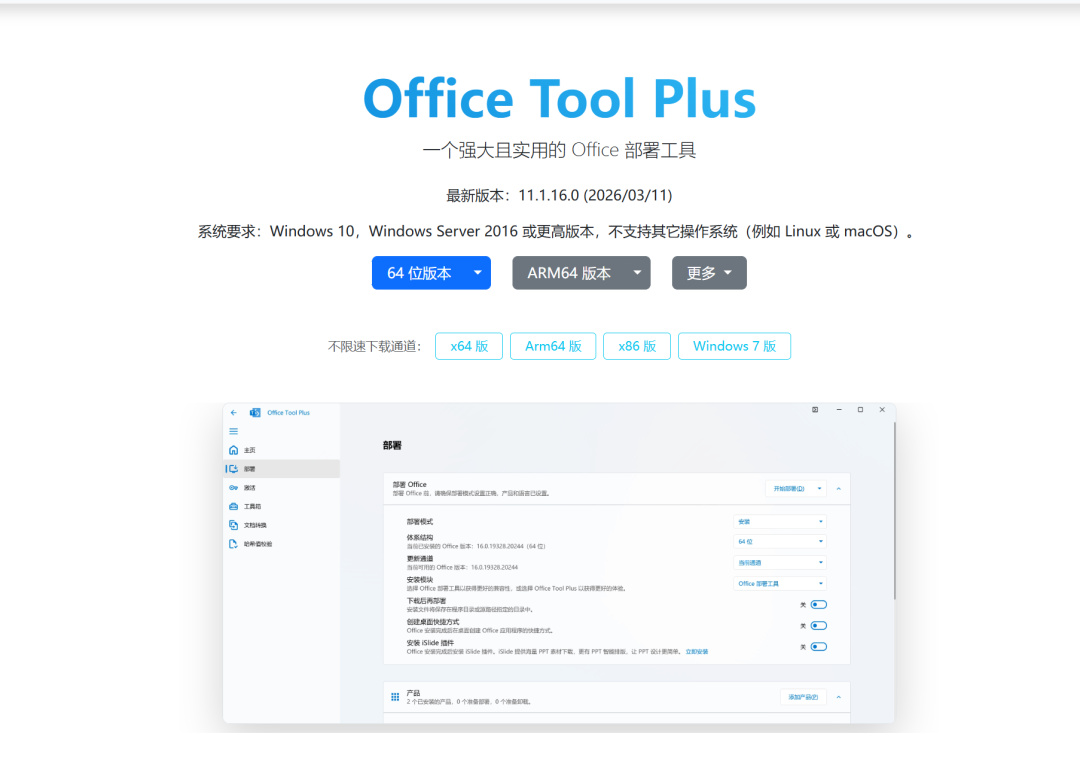 这里给大家分享一个工具,Office Tool Plus。功能没什么特别的,就是一个基于MSOffice部署工具开发的全能办公辅助工具