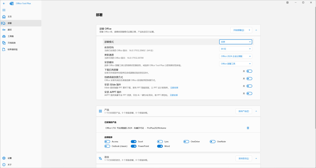 它的核心功能之一是高效部署与下载Office。内置高速下载引擎,可从微软官方服务器获取文件,支持Microsoft 365及Office、Visio、Project 2016至2024全版本,涵盖所有更新通道和语言包。