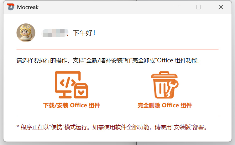 另外还有一个同类型的工具Mocreak也非常好用(这两个我都用过)。相较于Office Tool Plus,Mocreak的界面更加精简直接,便捷版打开就是两个核心功能,一个是下载安装,一个是完全删除。