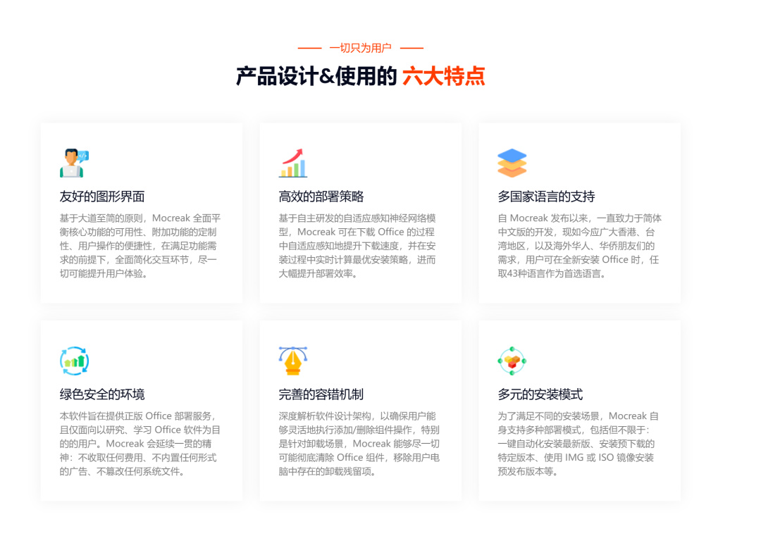 工具能自适应 x86、x64 架构,支持高度定制化配置,默认仅安装Word、PPT、Excel 核心组件,全家桶功能可自由增删,同时支持43种语言作为首选安装语言。