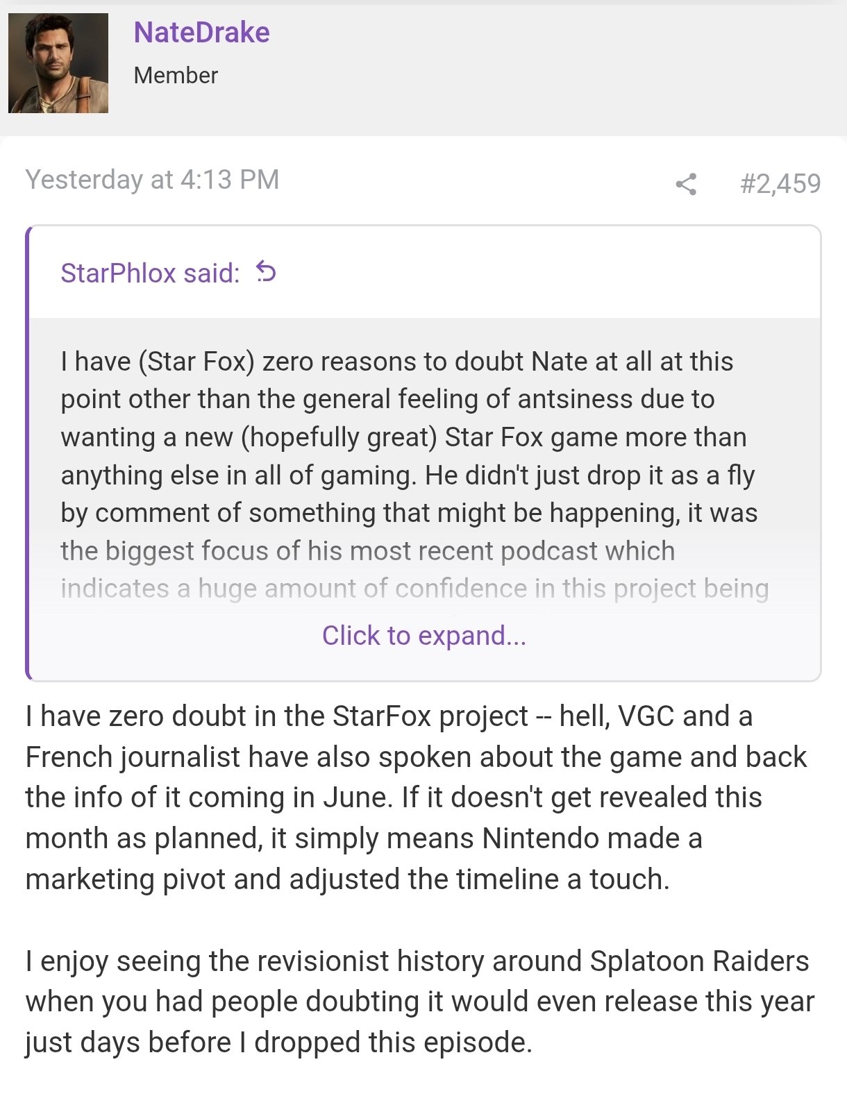 在回应该游戏的相关讨论时,NateTheHate对其存在和时机表达了强烈的信心,他表示:“我对《星际火狐》项目的存在毫不怀疑——实际上,VGC和一位法国记者也谈及过这款游戏,并支持其将在六月到来的信息。”他补充道,如果游戏未按先前预期的四月窗口期公布,那很可能是因为任天堂调整了营销计划,他解释道:“如果它没有按计划在本月公布,那仅仅意味着任天堂进行了营销策略的转向,并稍微调整了时间线。”