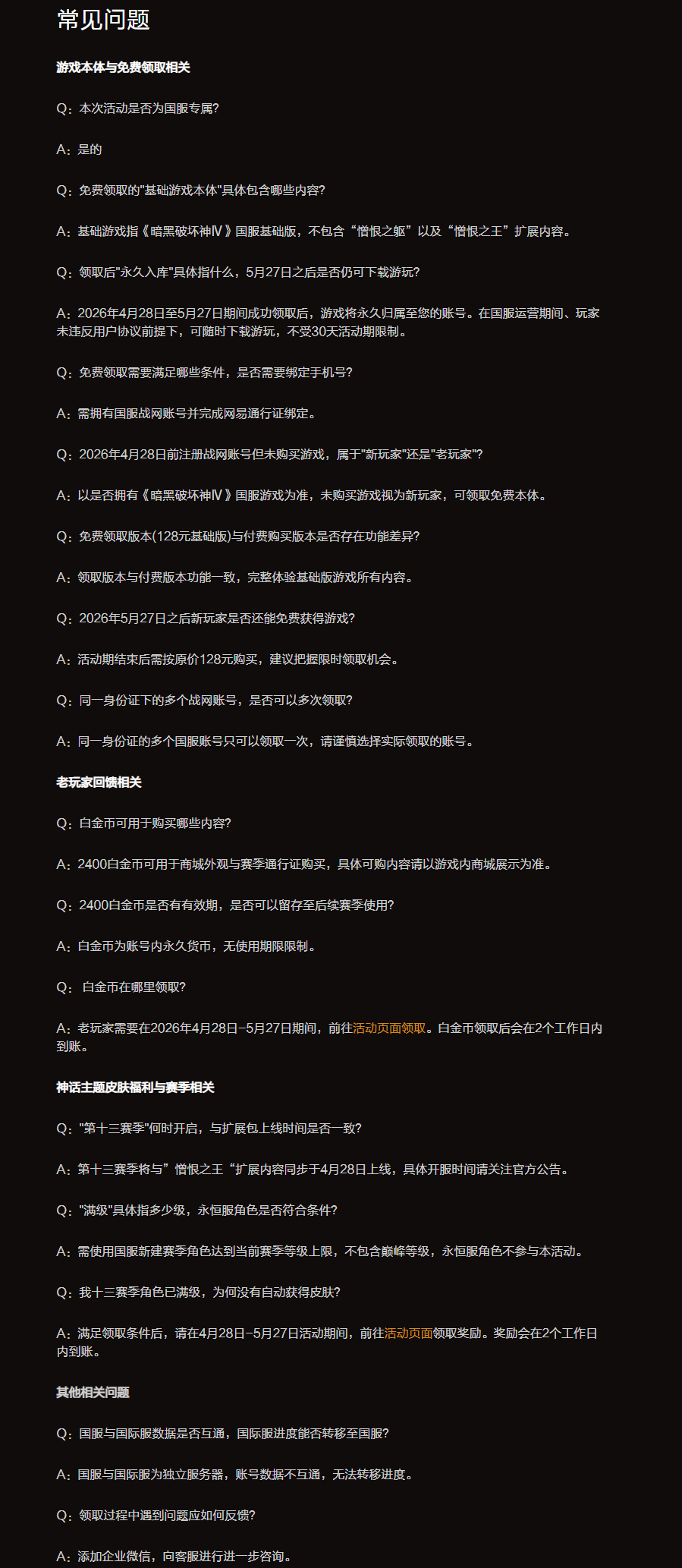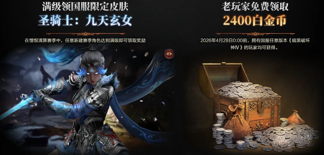 2026 年 4 月 28 日 0:00 前,拥有国服任意版本《暗黑破坏神4》的玩家均可获得 2400 白金币