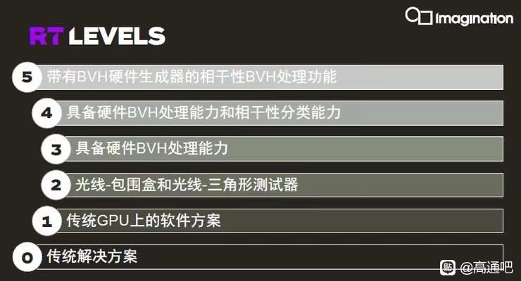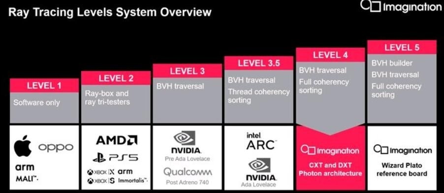 硬件光追(Hardware Ray Tracing),硬件光追我就不用多说了吧,相信大家都懂,我们具体说说RT的实现。我记得应该是21年那阵,IMG CXT在发布的时候提出了一个很新颖的观点,那就是RTLS(RT LEVELS)从0到5一共6级,如图所示,当时只有桌面端的NVIDIA和AMD才支持比较初级的达到2和3级的光追(NVIDIA好歹有硬件BVH,算3级,AMD没有,只算2级),而移动端没人支持硬件光追,基本都是1级的软件光追,而这时候,IMG推出的CXT直接支持了4级的光追,其不仅拥有硬件BVH,还能够用其处理相干性分类。可惜理想是美好的,现实是残酷的,没有人用。(虽然Tensor G5用了DXT,但是也没装RT Core啊,只有可怜的RT 0.5……,Tensor G6更幽默,退回了CXTP,虽然我并不清楚哪来的CXTP,我只知道有DXTP),很快到了下一年,NVIDIA的Ada Lovelace升级了RT-Core,加入了Shader Execution Reordering(SER),可以动态组织、重排 shading workload。很显然,在22年,NVIDIA首先支持了4级的RT,**AMD的RDNA3却依旧只支持2级的RT(RDNA2/3的描述是shader-based tr**ersal and intersection accelerator。这说明遍历主体仍偏 shader-side,硬件更像 intersection accelerator,所以是2级)到了RDNA4才有了硬件BVH(BVH8、hardware instance transform、ray hardware stack management acceleration这类更强的 RT 专项硬件特征),达到了3级。intel Arc/Xe-HPG相当激进,RTU带有硬件BVH,且拥有TSU (thread sorting unit),能sort and re-emit shader threads to maximize SIMD coherence,还会把 individual rayscoalesce into coherent SIMD groups,是标准的4级光追实现,后来的Xe2/Battlemage也延续了这个设计。