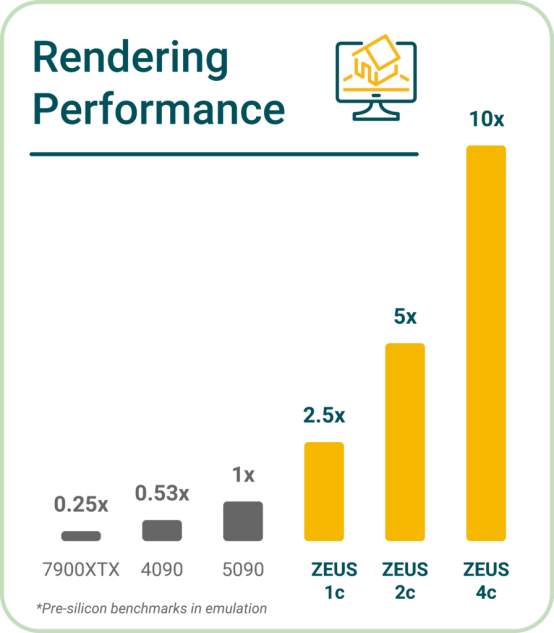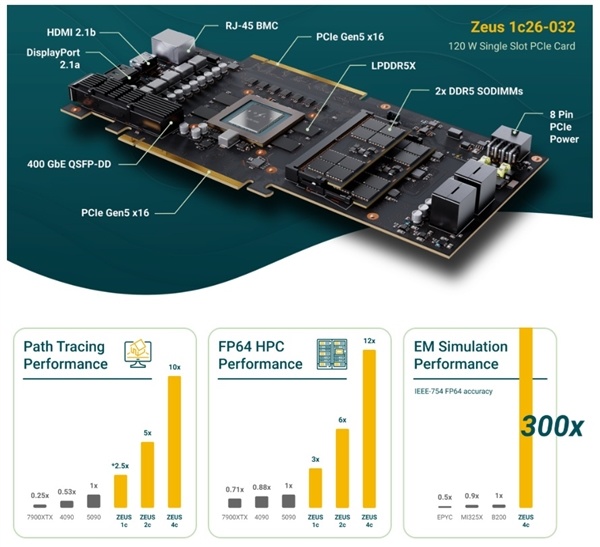 250W功耗的双芯宙斯2c26,对比575W功耗的英伟达RTX 5090,路径追踪性能提升5倍,高性能计算算力最高提升6倍;在电磁仿真运算中,4芯宙斯版本对比单张RTX 5090,性能差距达到300倍。