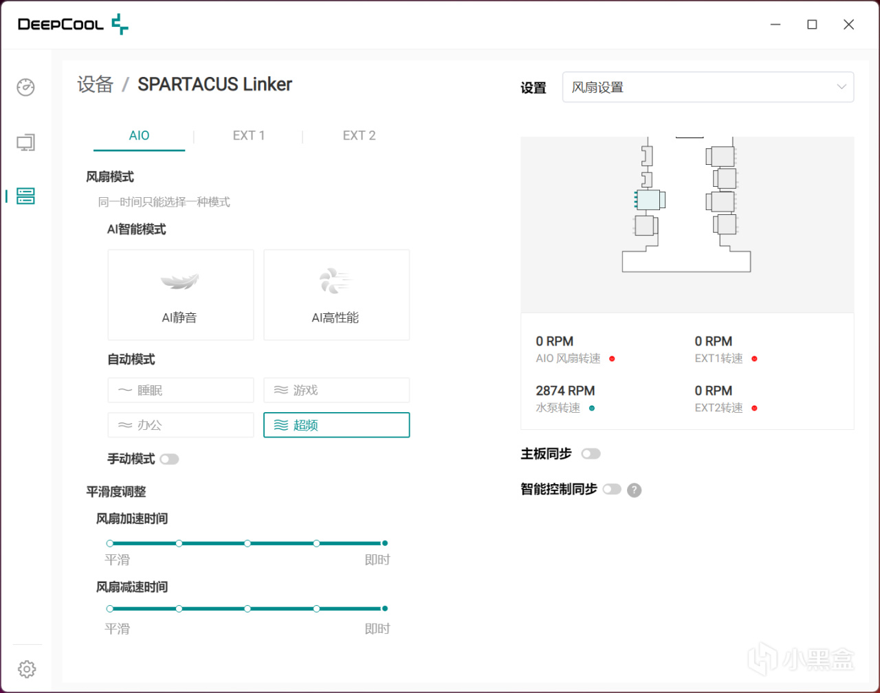 独立HUB的设置,具备睡眠、游戏、办公、超频和手动多种模式,还能调整风扇加速和减速平滑度(消除突兀的噪声变化),并支持主板和智能同步。值得一提的是,配合软件专用的AI驱动算法,它能协同CPU温度、水泵转速和运行噪声,实现动态优化散热器运行状态,支持AI静音和和AI高性能两种模式。
