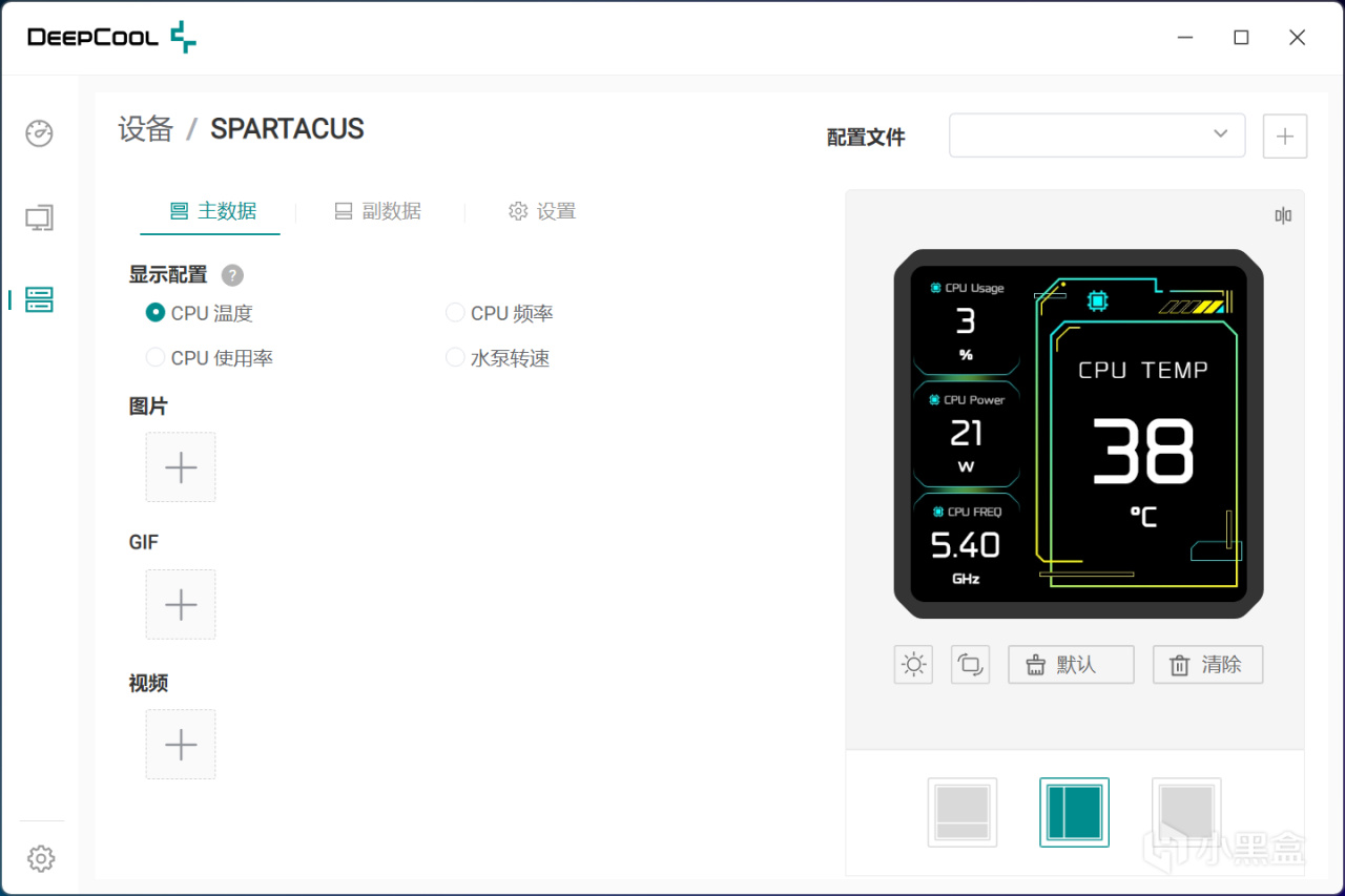 主数据这一栏,能显示CPU温度、CPU频率等主要核心信息,也可以变更排列方式,支持旋转和调节亮度,并支持上传图片、GIF和视频自定义素材。
