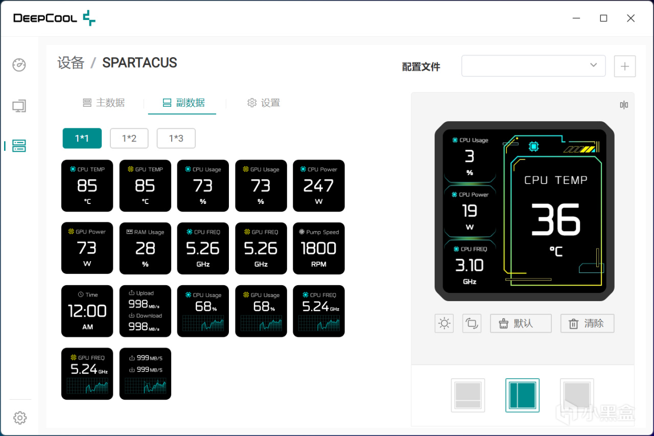副数据这一栏则是包括更多其他信息,比如水泵转速、CPU频率、GPU频率、时间、CPU功耗等,部分参数还提供实时曲线图,支持1*1、1*2和1*3多种排列方式,想要显示哪一块信息,直接拖动到右侧水冷的可视化示意图上就行。