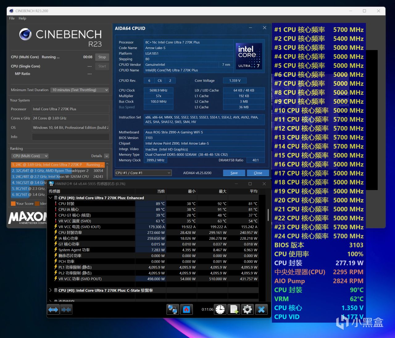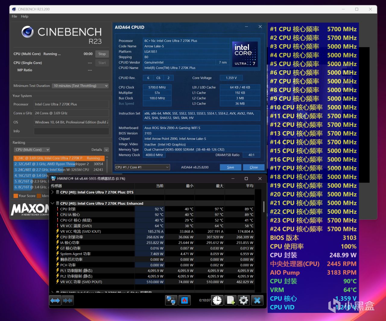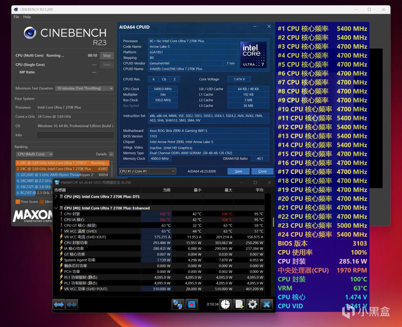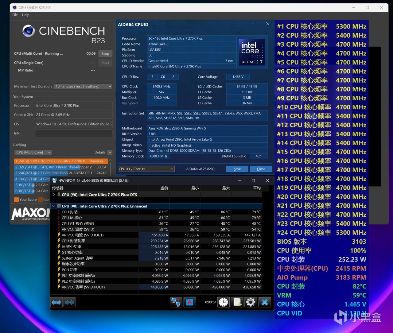 本次Ultra 7 270K Plus全程测试,将搭配华硕ROG Z890吹雪S主板,分为解锁功耗和超频两种不同压力的测试,测试项目是CINBENCH R23多核循环十分钟,使用HWiNFO展示温度、功耗等数据,处于26℃空调房、开放式环境。