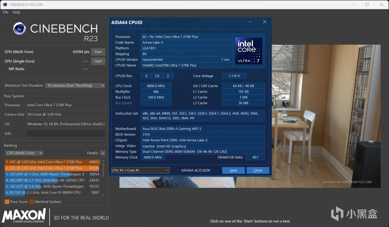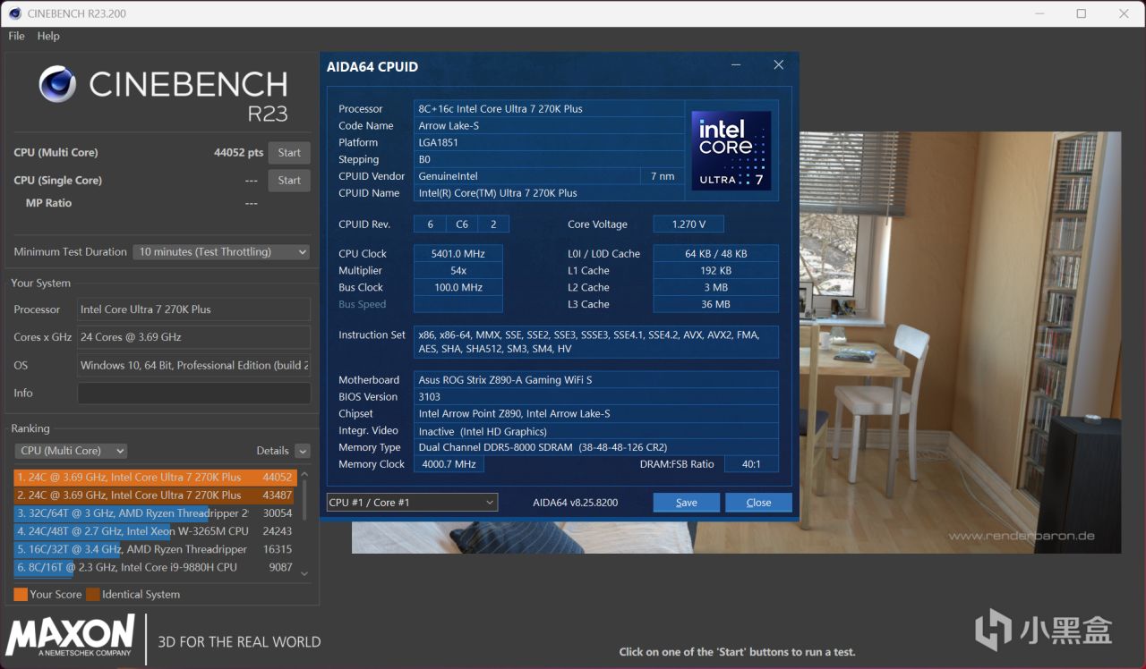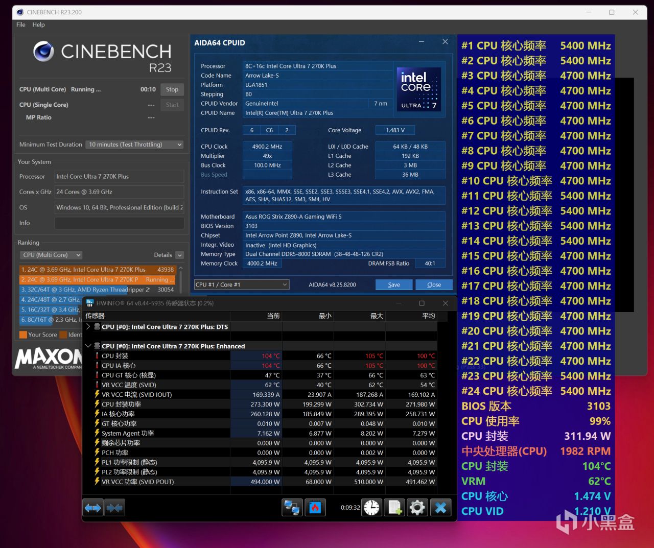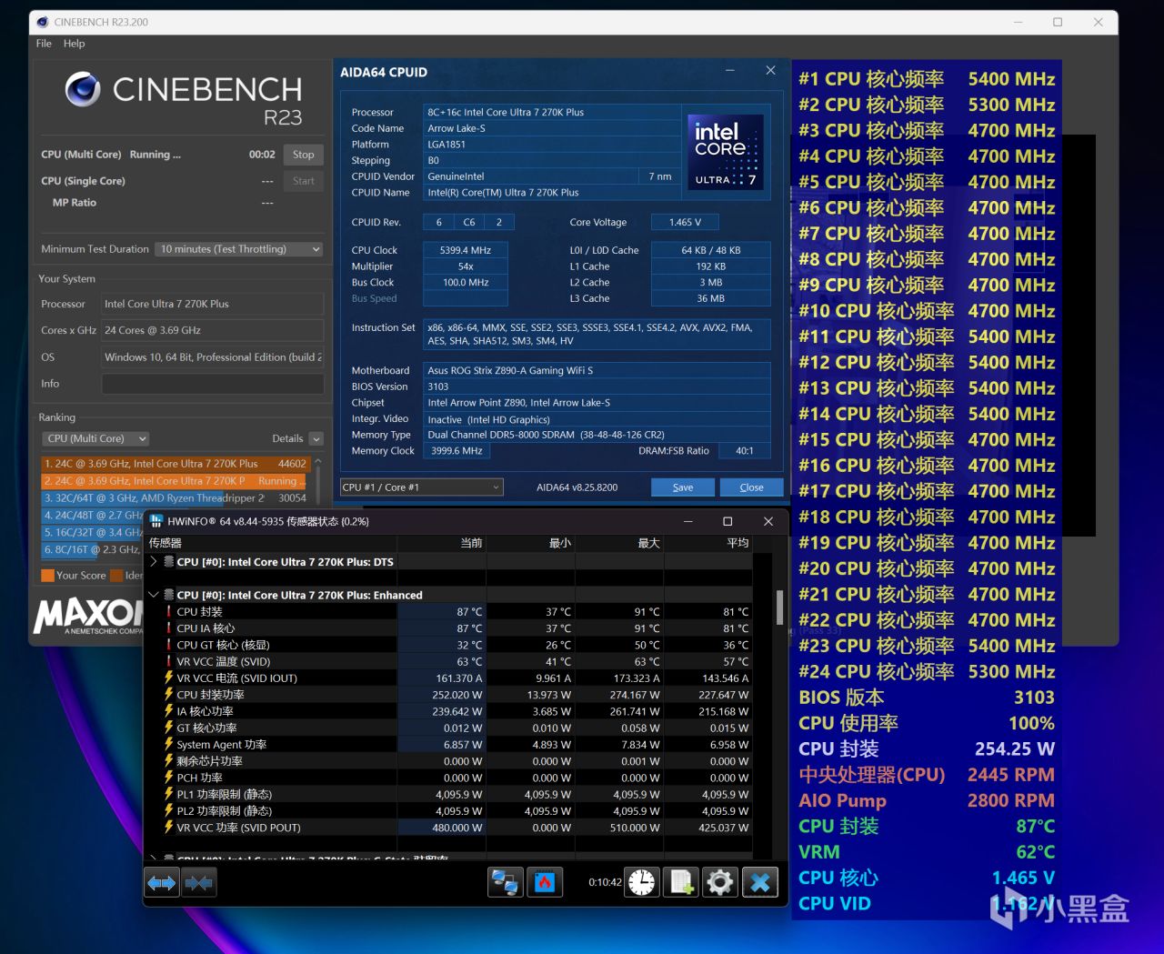 本次Ultra 7 270K Plus全程测试,将搭配华硕ROG Z890吹雪S主板,分为解锁功耗和超频两种不同压力的测试,测试项目是CINBENCH R23多核循环十分钟,使用HWiNFO展示温度、功耗等数据,处于26℃空调房、开放式环境。