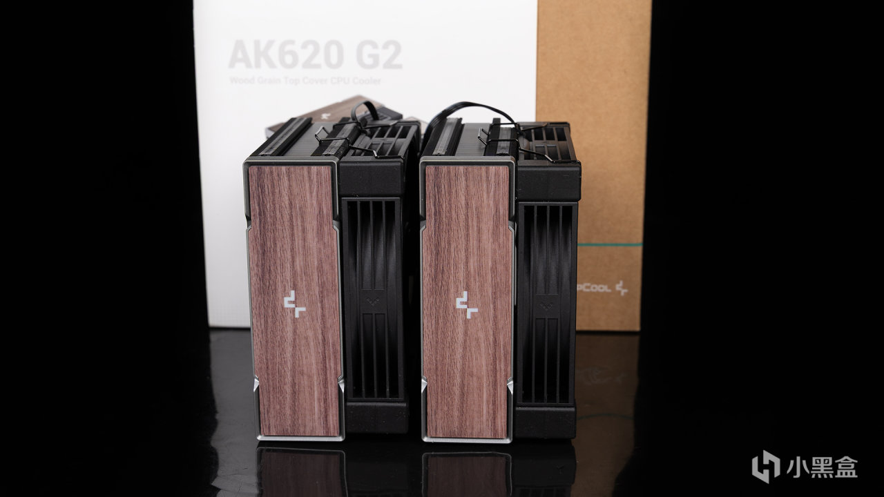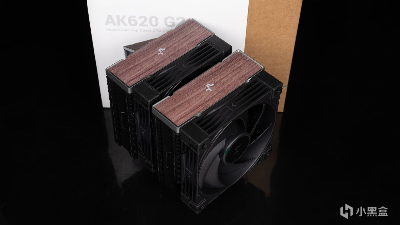 九州风神AK620作为自家的主打款双塔风冷散热器,它提供了标准版、青春版、数显版、G2等众多型号,手上这款就是AK620 G2暗夜,整体采用DeepCool家族化鳍片矩阵黑化设计,具备973640mm²散热面积,含风扇尺寸设计为127(L) x 144(W) x 159(H) mm,在双塔产品中属于高度偏矮,宽度和长度则是中规中矩。