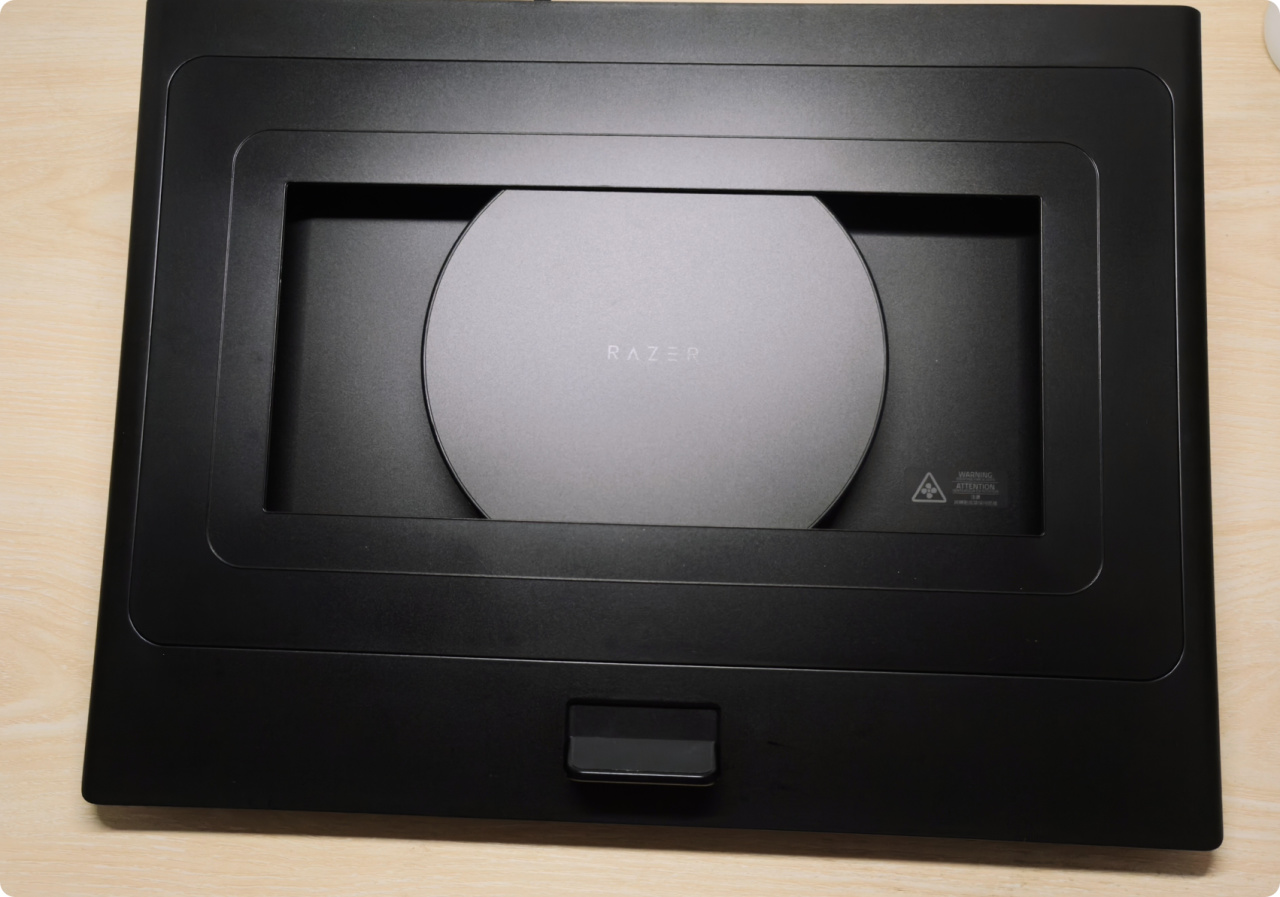 支架主體是金屬結構,穩固紮實。底部有獨立腳撐,可以抬高角度,避免進風口被桌面堵住。爲了適配 13 到 18 寸的筆記本,雷蛇還附帶了三個磁吸框架。磁吸的好處是結構簡單、穩定性高,不像伸縮結構那樣用久了容易鬆動。雖然需要用戶自己換框架,但體驗反而更可靠。