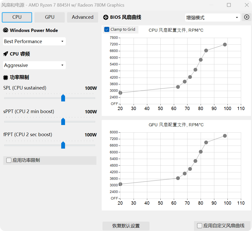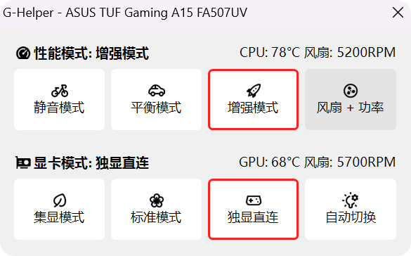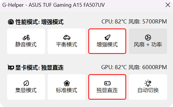 我的筆記本電腦是天選5銳龍4060。在G-Helper裏調整爲性能模式把功耗鎖到 100W,然後利用劍星來測試前後溫度對比。