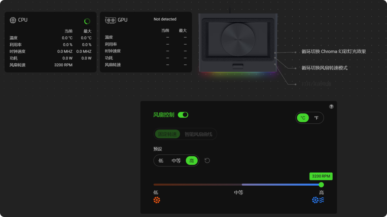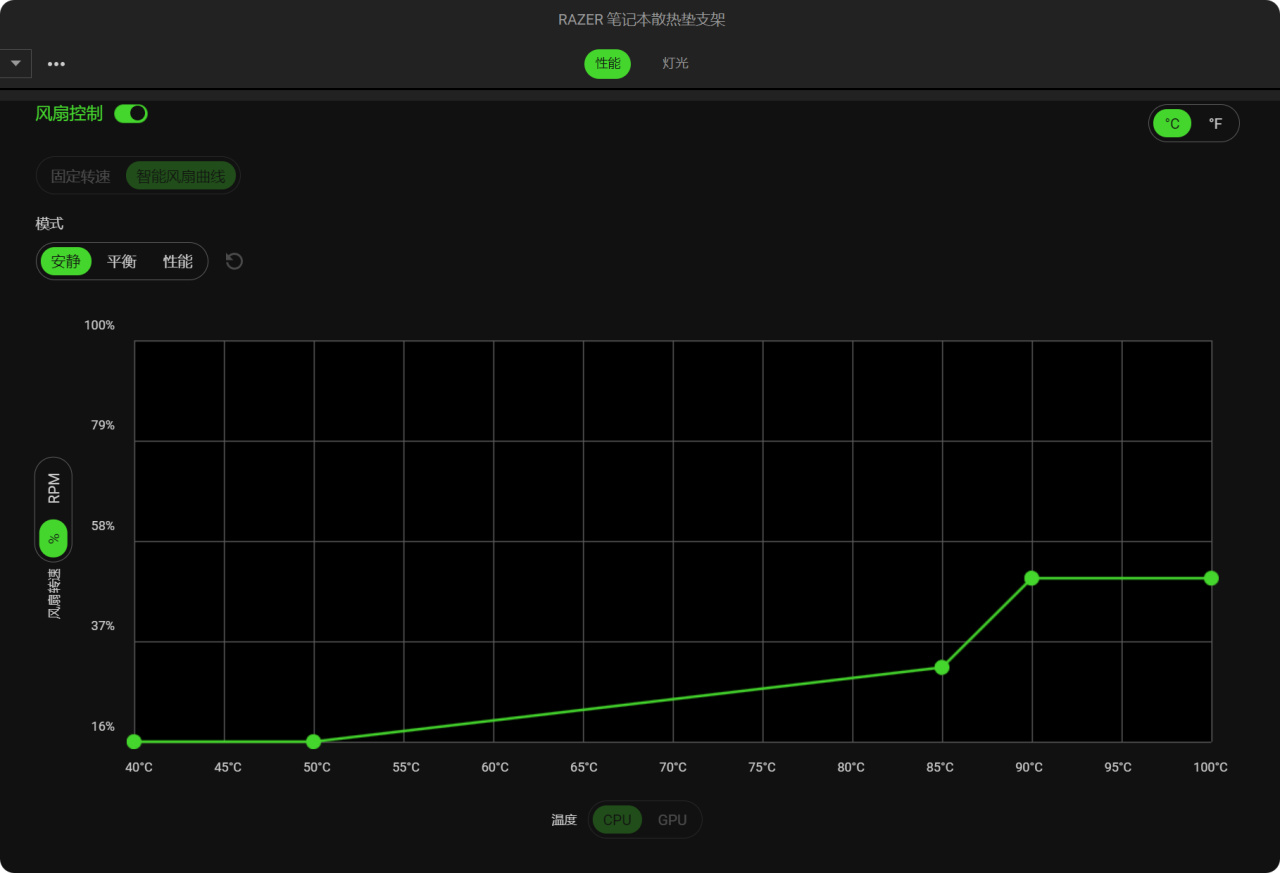 雷雲4中支持調節RBG燈光和風扇控制,可以設置固定轉速或者是智能風扇曲線,智能風扇曲線下可以選擇安靜、平衡和性能三個模式進行切換。
