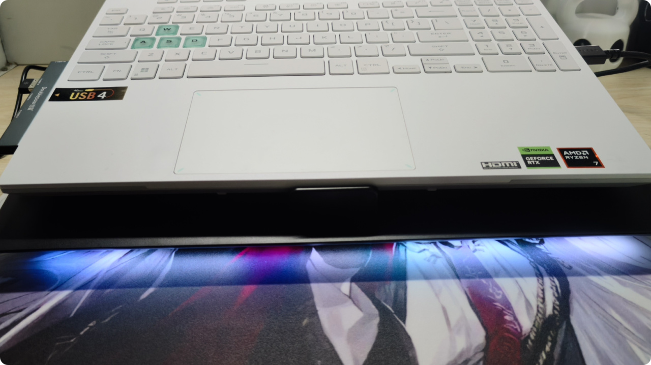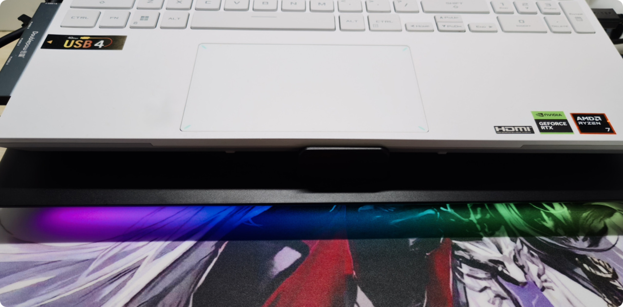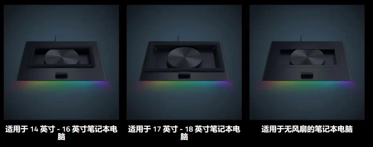 第一次看到它的時候,最大的感受就是:這東西真的很大。不是那種隨便墊一墊的支架,而是徹徹底底的“壓風式散熱”。正面一圈 RGB 燈效非常雷蛇,尤其是底部那條燈帶,和很多筆記本的 U 型燈效呼應得很自然。