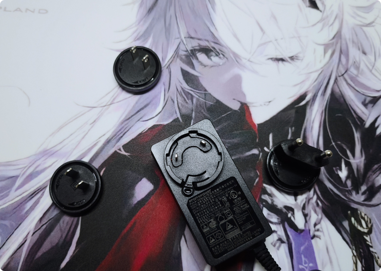 風扇全速時功耗能到 15–20W,普通 USB 根本帶不動,所以必須用獨立電源。適配器是 36W 的全能型,附帶三種國際插腳,出國也能直接用。這種適配器成本比普通適配器貴一倍,但省去了不同地區單獨做 SKU 的麻煩。