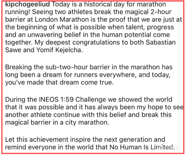 作为最早在 42.195 公里距离完成破 2 的“马拉松之神”,基普乔格第一时间在社交平台给后辈送了祝贺。
