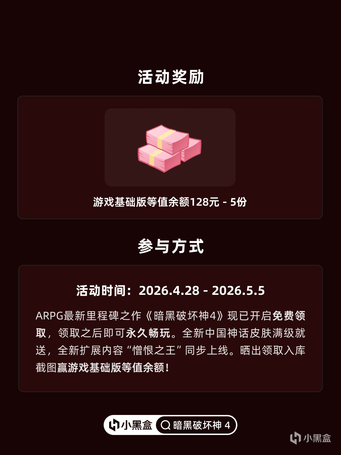 ARPG最新里程碑之作《暗黑破坏神4》现已开启免费领取(领取入口:https://api.xiaoheihe.cn/game/h20260427_activity/v2?act_id=69ef3c4131e74cc35d11900f 具体领取资格与可玩范围以活动页面显示为准),领取之后即可永久畅玩。全新中国神话皮肤满级就送,全新扩展内容“憎恨之王”同步上线。晒出领取入库截图赢游戏基础版等值余额!