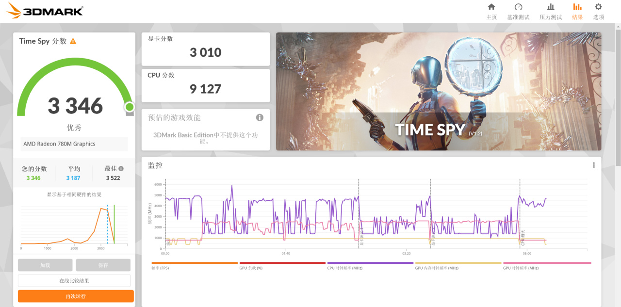 这枚U能干的可太多了,玩一玩网游和优化比较好的3A,完全没问题,甚至还能够把分辨率吃满。借朋友的跑分来看看理论性能,在7500MT/S LPDDR5X板载内存加持下,3DMark跑分为3000分出头。