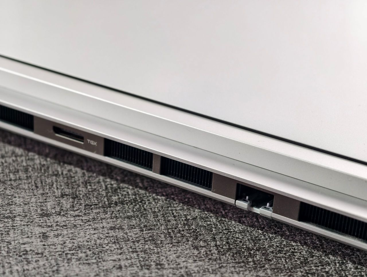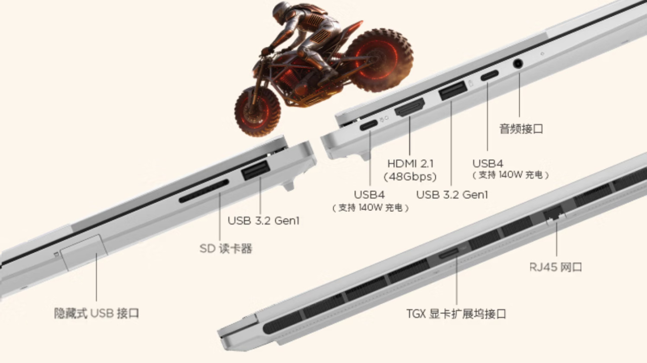 来到笔记本背面,除了大面积的散热口之外,还有一个TGX显卡扩展坞接口和一个RJ45网口,无论是需要外接显卡提升性能,还是需要稳定的有线网络,都能轻松满足,商务适配性直接拉满。