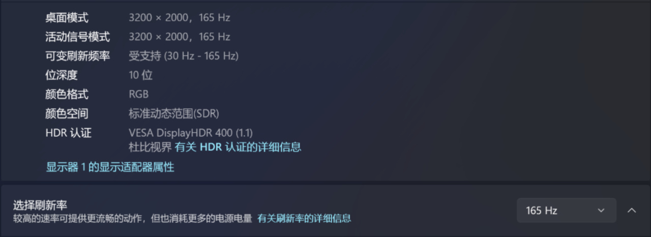 点亮屏幕后,屏占比表现相当不错。这块屏幕分辨率为3200×2000,覆盖100%DCI-P3广色域,不仅分辨率比常规2K屏更高,还支持0~165Hz VRR可变刷新率,对于笔记本节能有不少帮助。
