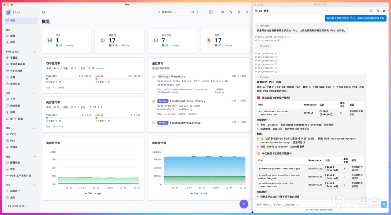 內置 Kite AI Chat 助手,支持自然語言查詢集羣狀態、分析異常 Pod 原因、定位故障根源,降低運維操作門檻。