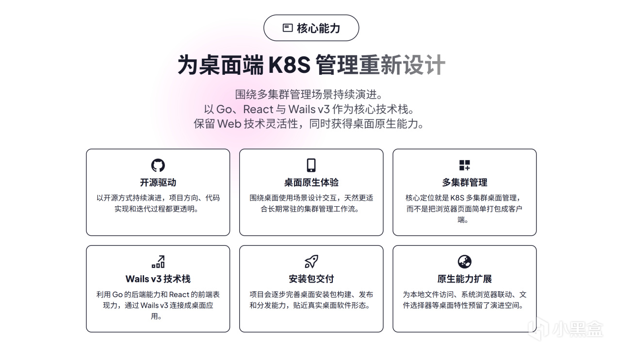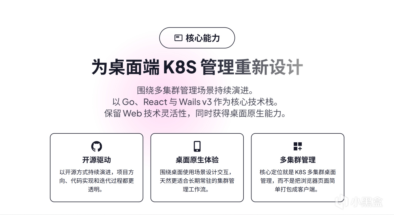 核心技術棧爲 Go+React,兼顧後端集羣交互能力與前端界面表現力,支持桌面原生窗口、文件訪問、系統聯動等特性。