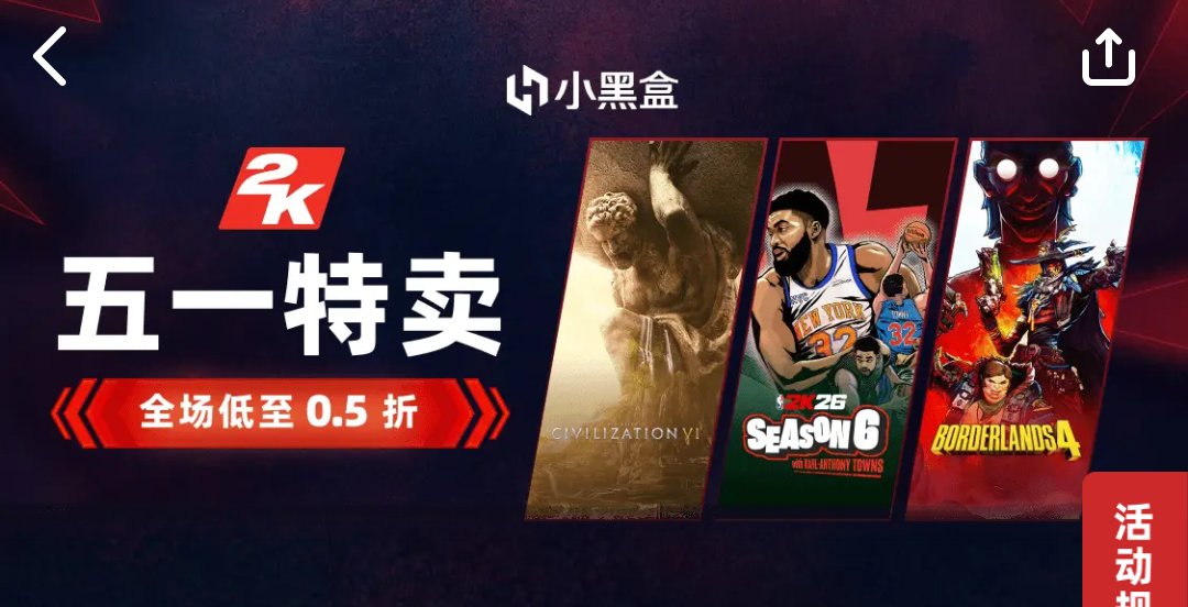 现已临近五一,许多游戏都开始了cdkey提前折扣,其中就包括2k,2k旗下多款游戏在小黑盒迎来了超史低的折扣,同时2k在小黑盒开启了一个抽奖活动!