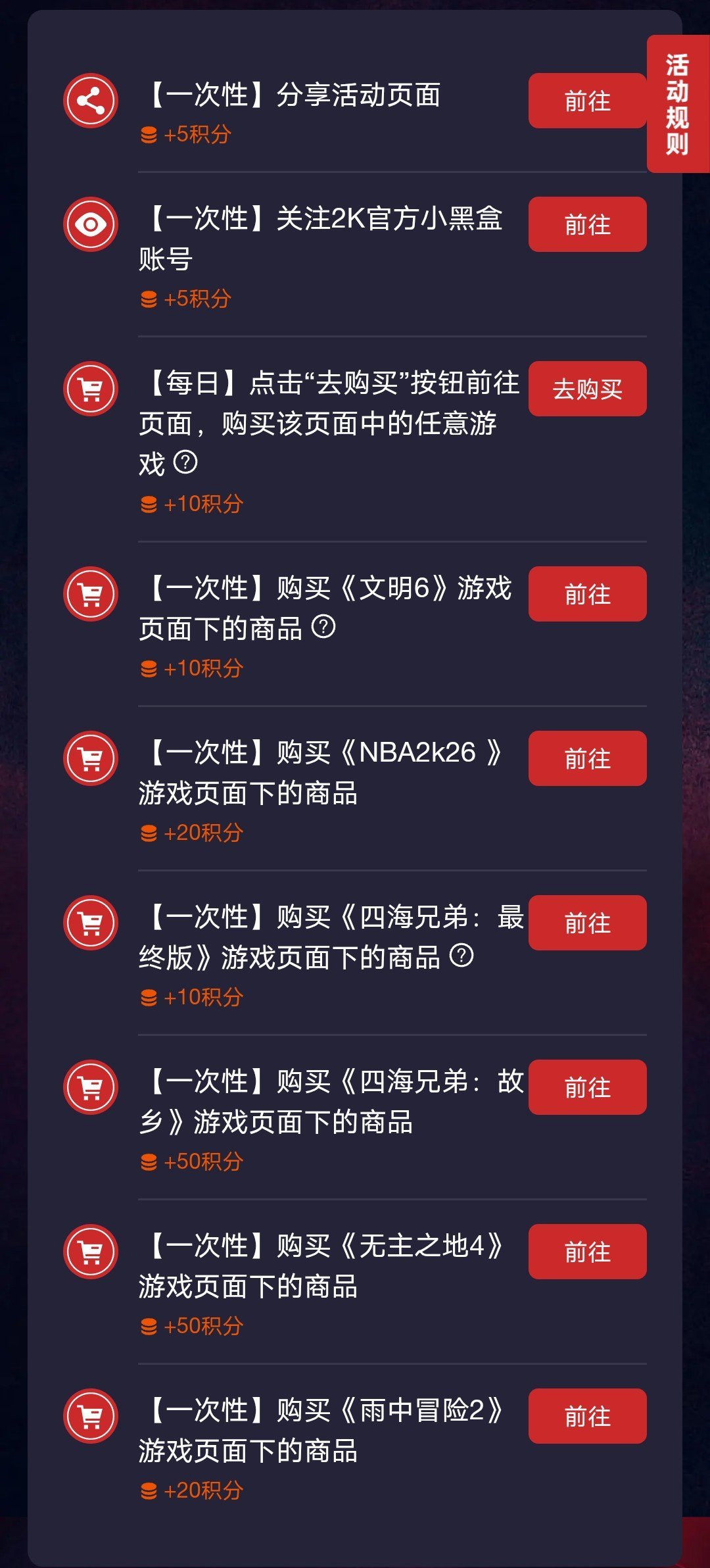 2.本次活动抽奖积分可通过完成「做任务抽好礼」中的活动任务获取。其中,「每日任务」将在活动期间每日00:00更新;「购买|类型的任务仅限用户在黑盒商城内购买游戏商品;非活动期间的分享、关注、购买等行为将无法完成任务。