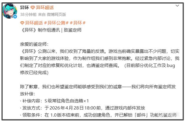 最讓玩家意外的是這次的補償力度,不是常規的環石,直接給S 級常駐角色自選箱,這波福利在同類遊戲裏相當少見。補償會在 4 月 28 日 18 點前通過遊戲郵件發放,只要在 1.0 版本結束前創建角色並解鎖郵件功能,就能直接領取,門檻很低。