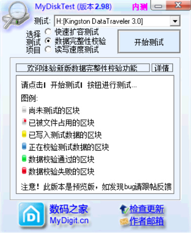 我們點擊磁盤工具模塊,這個部分主要給大家介紹兩個軟件,首先就是MyDiskTest,這個軟件可以說是大家看到過的各種識別擴容盤教程中最常見的一個,功能確實比較完善,可以快速擴容測試,可以測讀寫速度,也可以做全盤的寫入以及校驗,其實使用的時候最主要用的就是快速測試以及全盤的寫入校驗,測讀寫速度我更傾向於使用DiskMark。