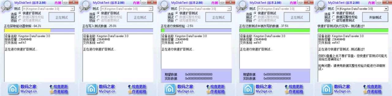 首先快速擴容測試,主要就是讀取磁盤驅動器快照,寫入文件、校驗快照然後還原被改寫的文件,整個測試流程下來,一些僞裝不高明的磁盤可能通過不了,甚至是沒有辦法開啓這個快速擴容測試,但是這個測試也沒有辦法給是否是擴容盤下出準確的結論,畢竟沒有進行全盤的寫入與校準,一些實際容量沒有特別小的擴容盤還是有概率騙過軟件的。
