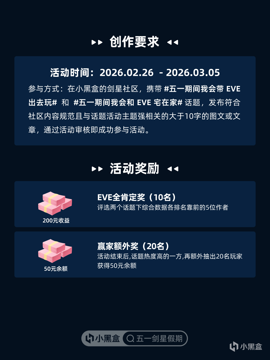 EVE全肯定奖(10名):在“带 EVE 出去玩”和“和 EVE 宅在家”两个话题下,各评选出 5 名内容质量最佳的作者。我们将结合投稿数据(点赞、评论、转发)及内容相关度进行排名,每位获奖者将直接获得【200元收益】。