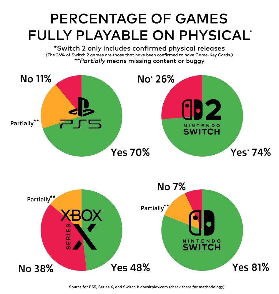 而对于全部主机平台而言,NS1平台拥有最好的即刻离线游玩支持度,NS2平台居于完全能和完全不能之间,而Xbox series少于一半都不能即刻离线游玩,以及拥有最多占比的无法离线游玩的实体游戏。