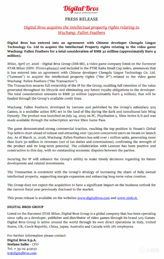4 月 28 日,意大利 Digital Bros 集团(505 Games 母公司)正式官宣,已完成对国产类魂 ARPG《明末:渊虚之羽》IP 的全额收购,交易作价 3200 万元人民币(约 400 万欧元)。同步披露的财务数据显示,截至 2026 年 3 月 31 日,本作全球销量突破100 万份,扣除平台佣金与税费后,净收入达2.4 亿元人民币(3000 万欧元),商业表现亮眼。