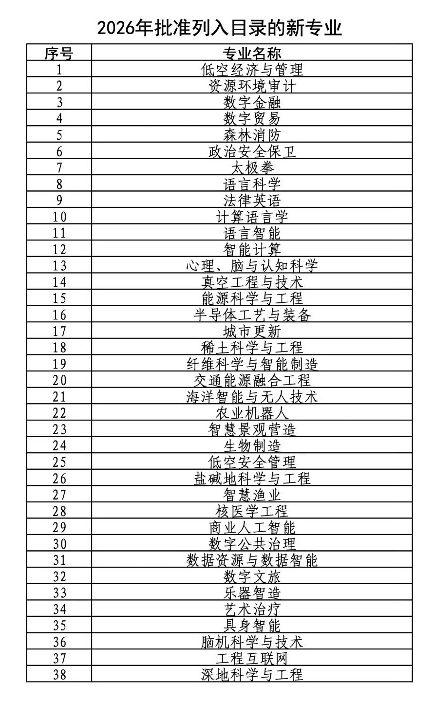 4月28日,教育部正式发布《普通高等学校本科专业目录(2026年)》,本次目录共新增38种本科专业,首次设立“交叉学科”门类,全国高校专业调整比例首次突破10% 。新专业将于2026年高考起纳入招生范围,精准对接新质生产力发展需求 。