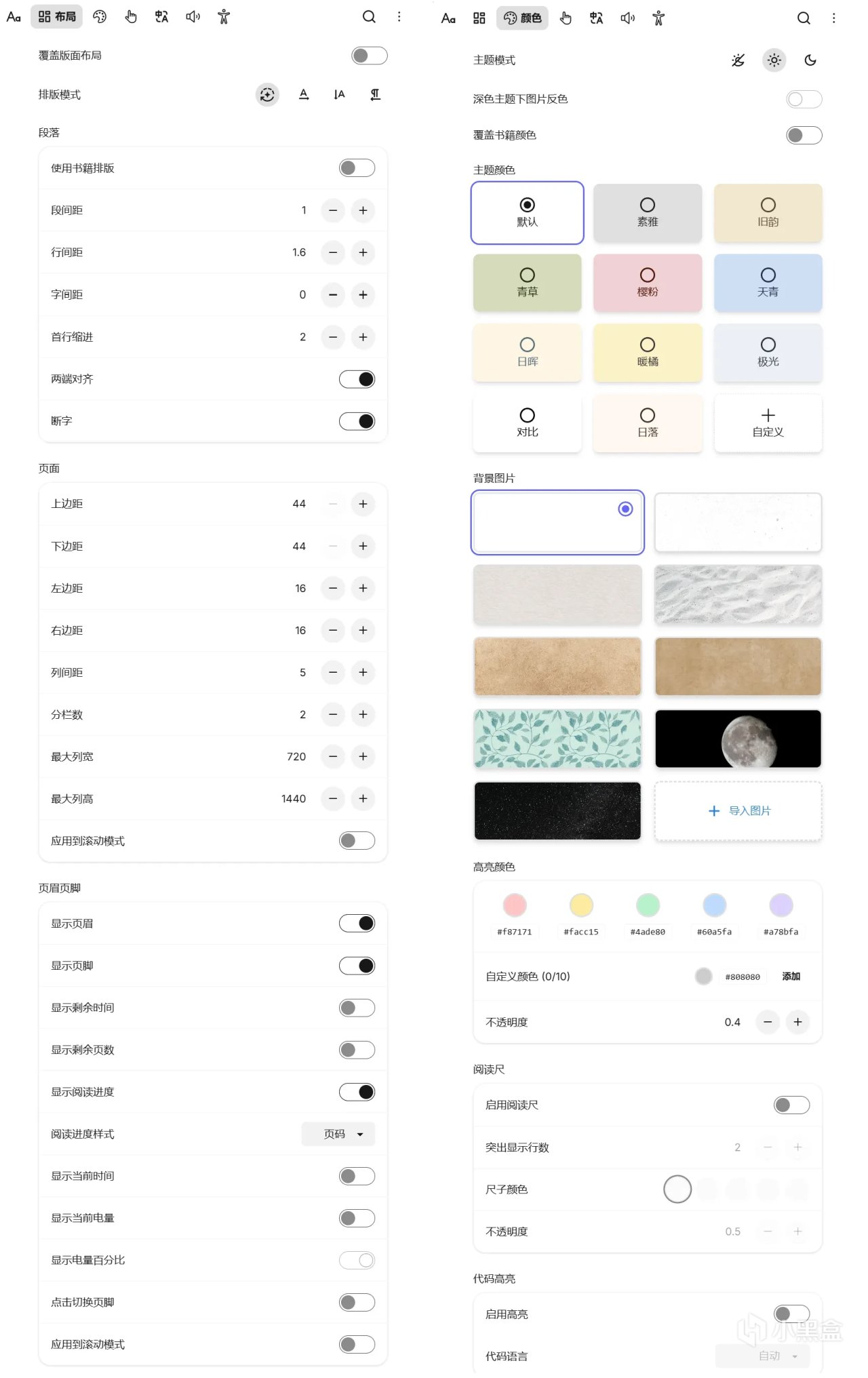 多主题模式:内置浅色、深色、护眼棕褐三大主题,支持自定义背景色、纸张纹理,白天黑夜都护眼