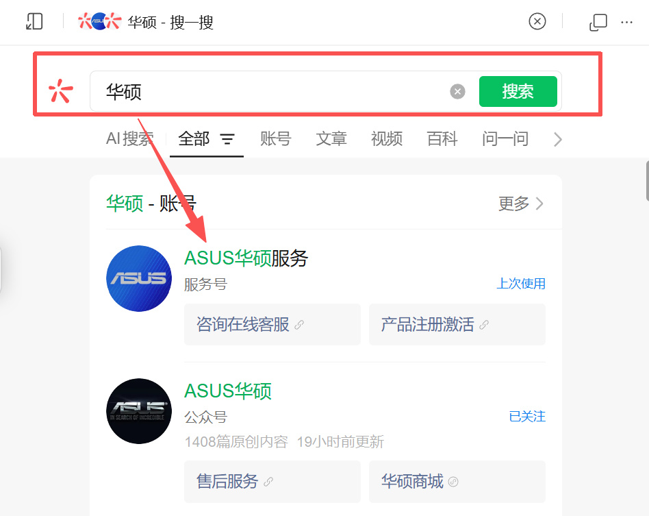 華碩主板(三年質保+註冊一年換新)首先在綠泡泡搜索華碩,找到華碩服務
