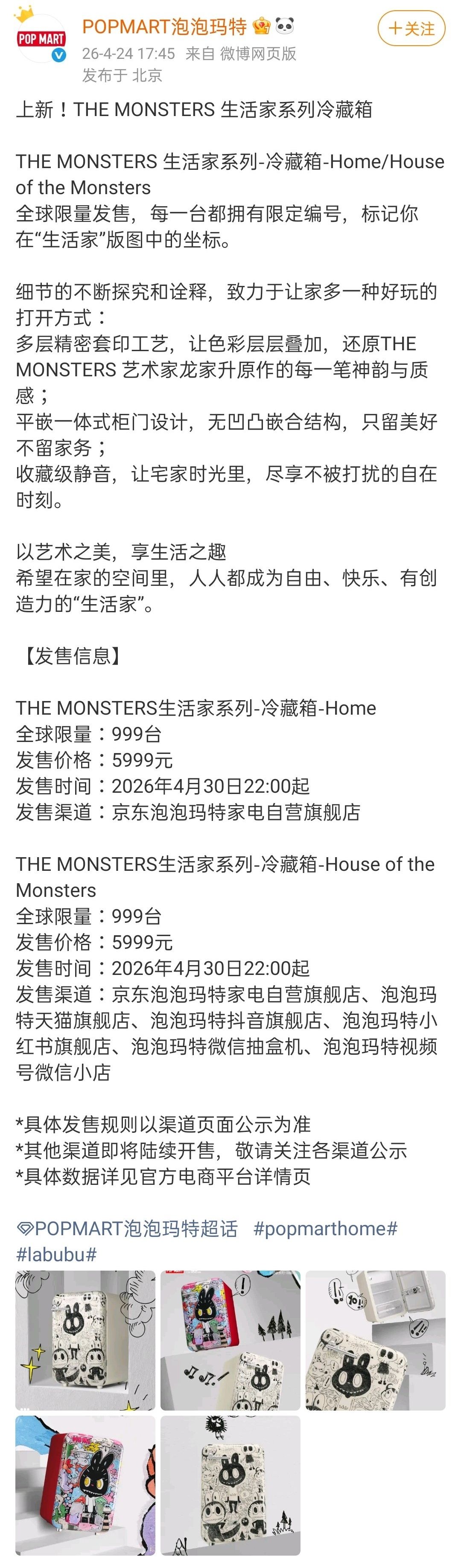 此次發佈的LABUBU冰箱分爲Home款和House of the Monsters款兩個版本,全球各限量999臺,統一售價5999元,將於4月30日22:00在某東、某貓等平臺正式開售,每臺均帶有全球唯一限定編號 。