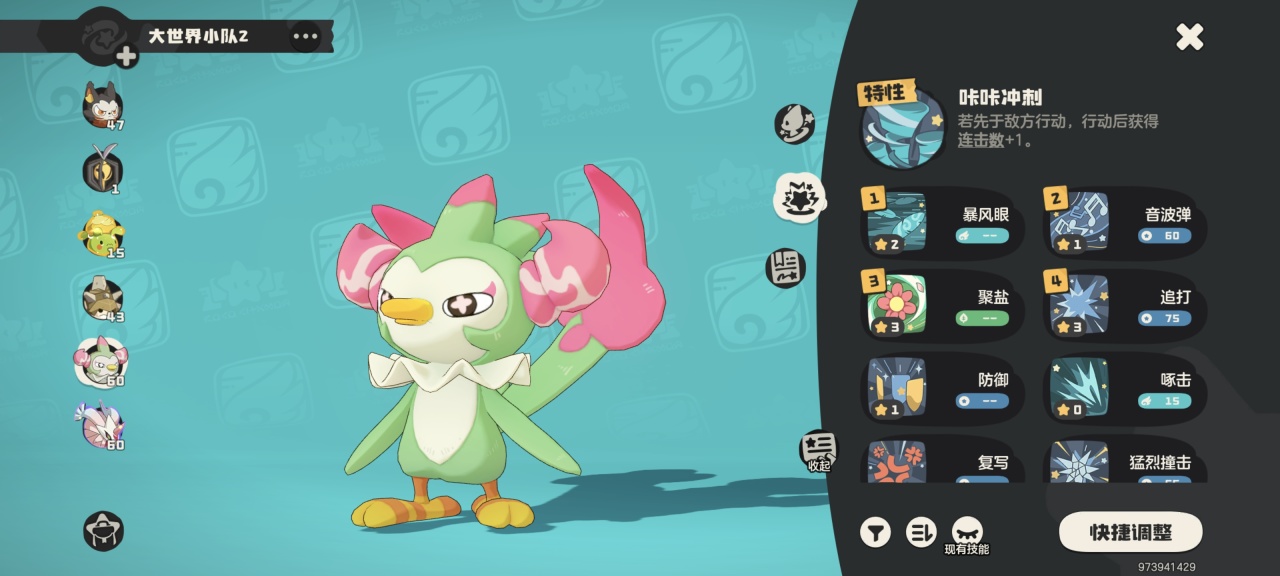 其他三个技能都是咔咔鸟自带的,聚盐需要伊贝粉粉使用一次聚盐,这个大家之前刷星光对决一般都完成了,成本这一块主要还是抓满速度的咔咔鸟。