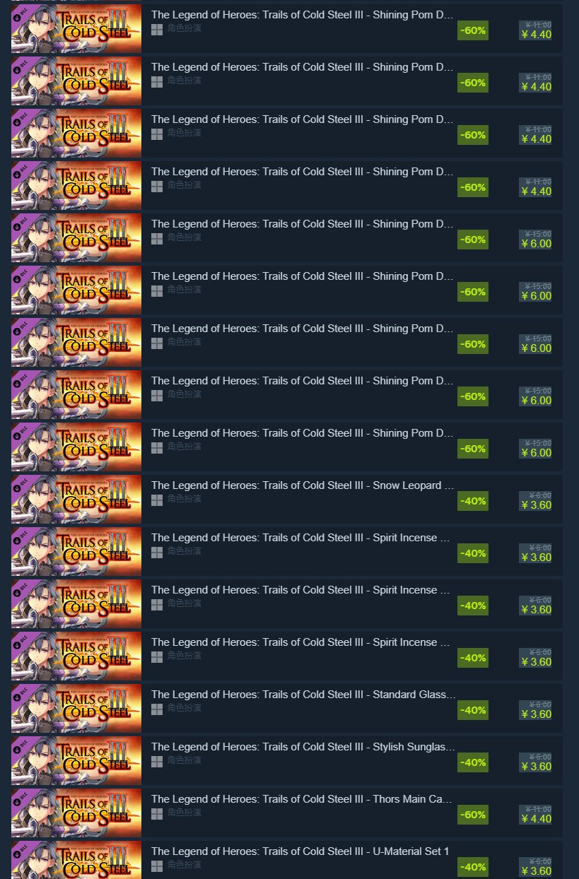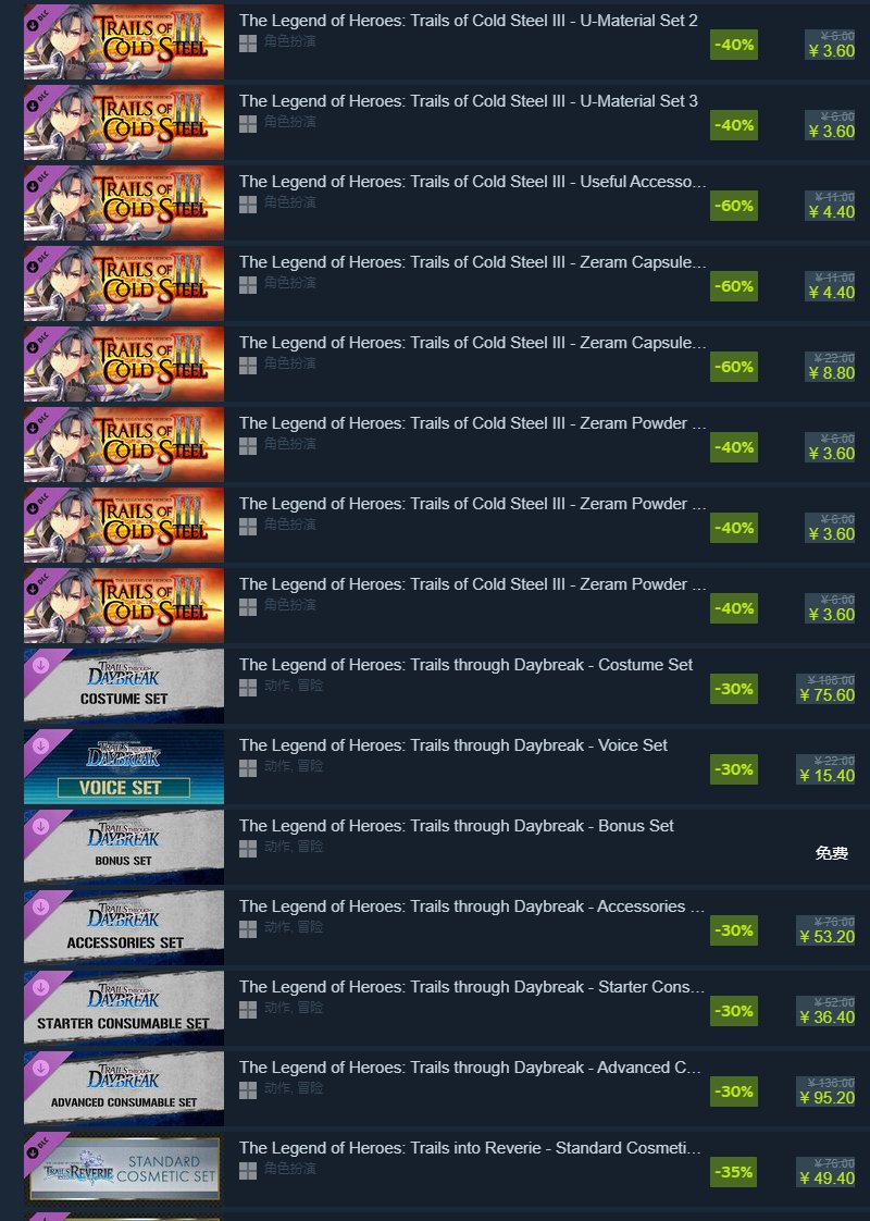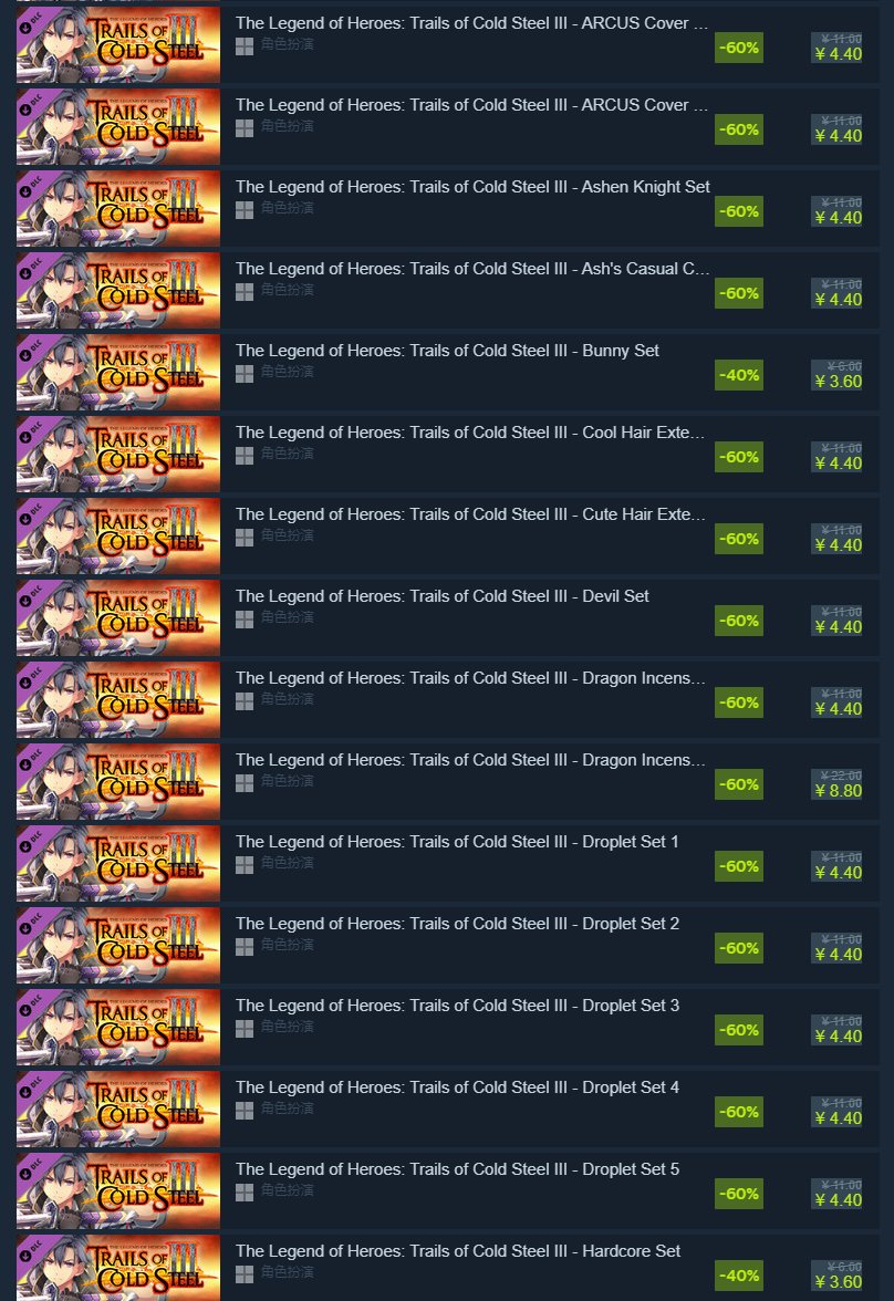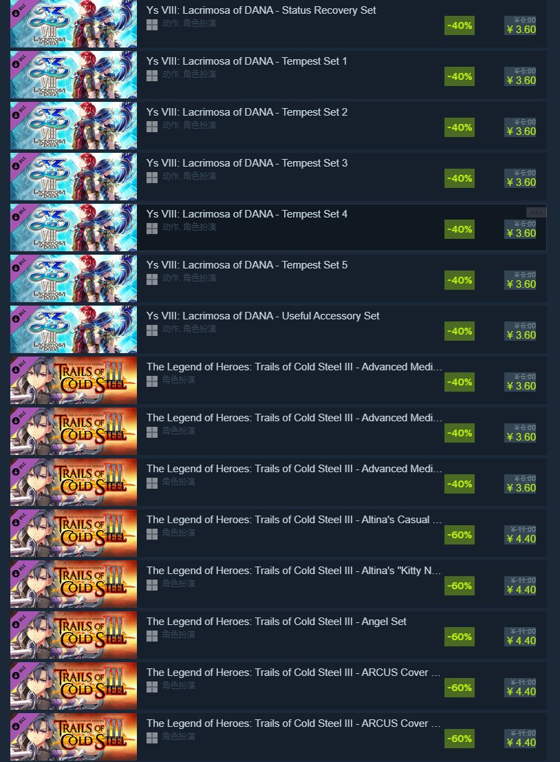 里面包含《英雄传说》、《伊苏》的多款游戏以及诸多DLC,光是往下滑就滑了五页。