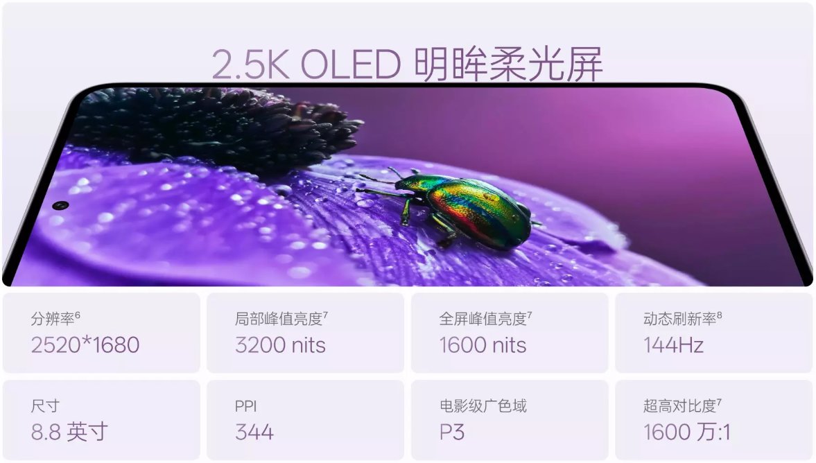 8.8英寸 2520×1680 OLED居中挖孔屏,144Hz LTPO,3:2屏幕比例,四等窄边;