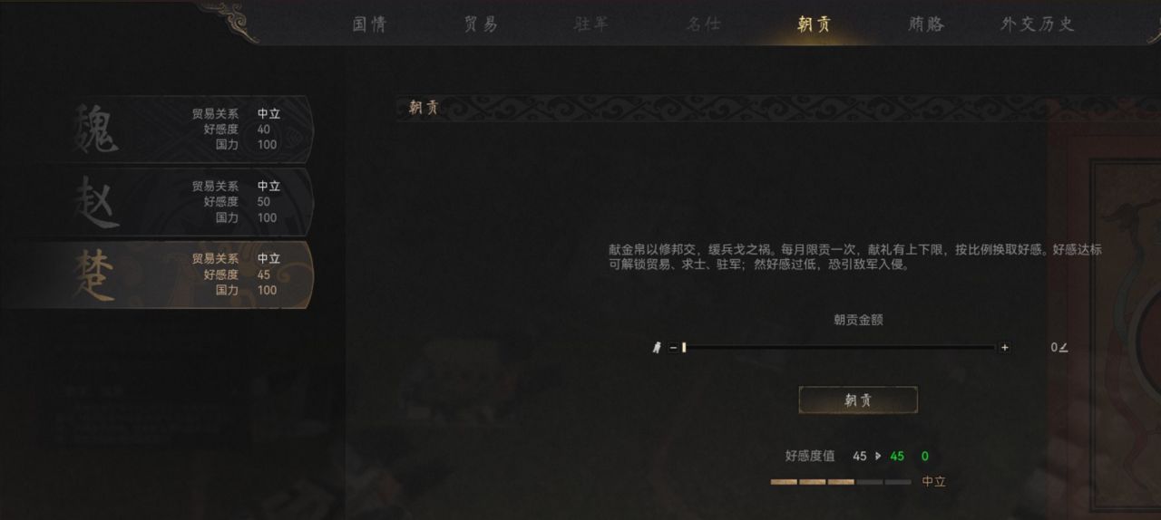 是對弱國態度強硬,對強國阿諛奉承都是我們在遊戲中自由選擇的,想要與哪個國家快速提高好感度,可以和他納貢或者做交易,在與其他國家做來往時,也會知道很多國內沒有到信息差。