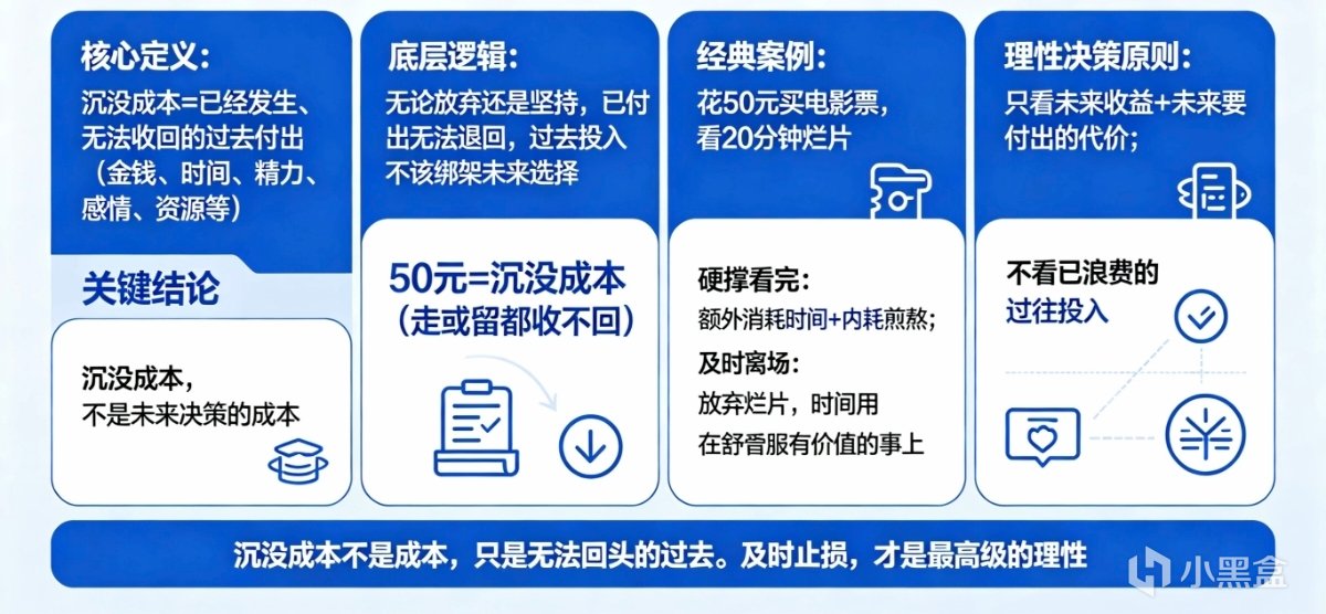 举个例子:你花50块买了张电影票,看了20分钟发现是烂片。这50块就是沉没成本。你是继续看下去,还是起身走人?理性的选择是:只看未来的收益。继续看,你要再付出1个半小时的“时间成本”,换来的是煎熬;离开,你可以回家看书、追剧、睡觉。那50块,无论你走不走,都已经没了。