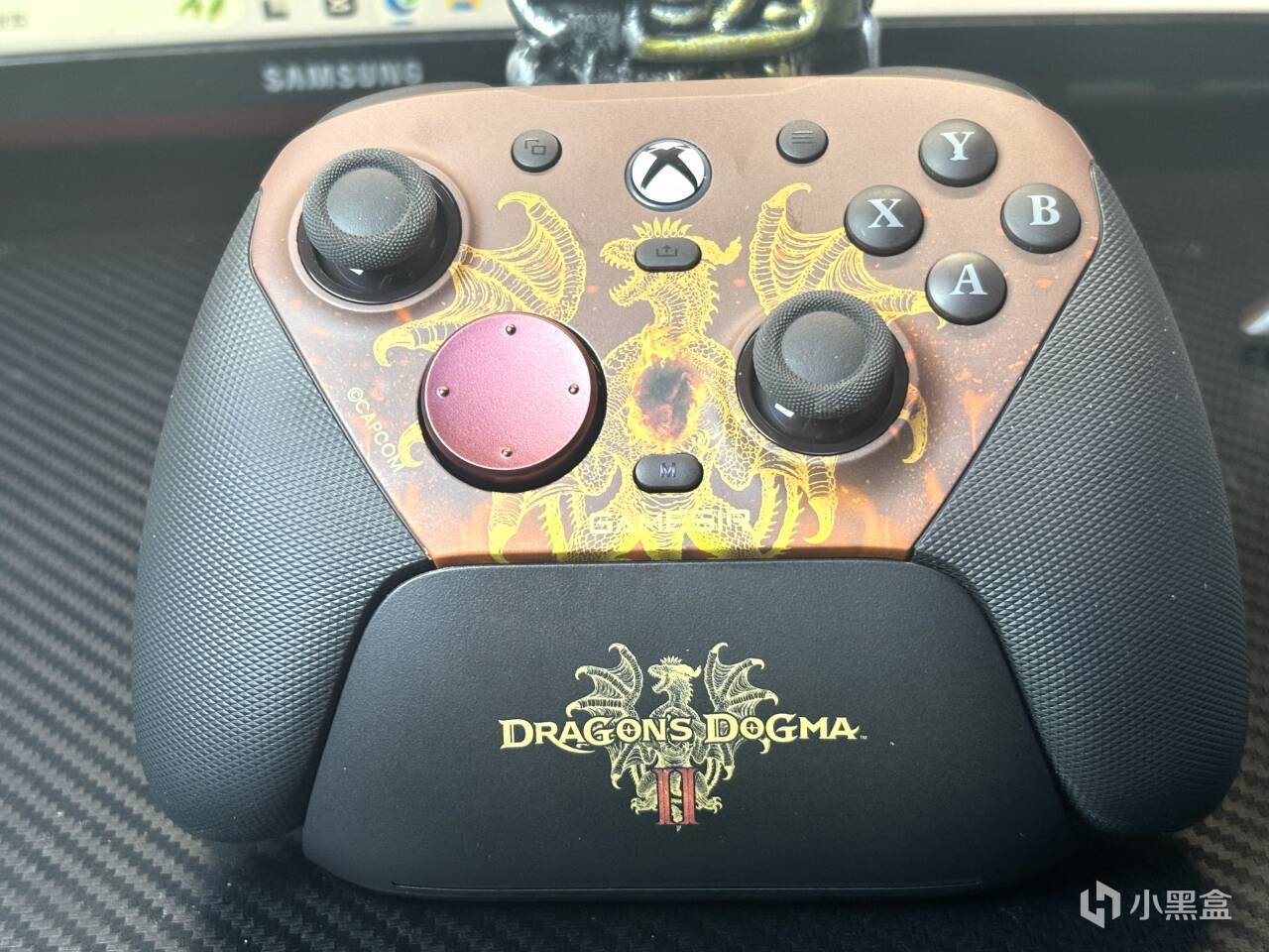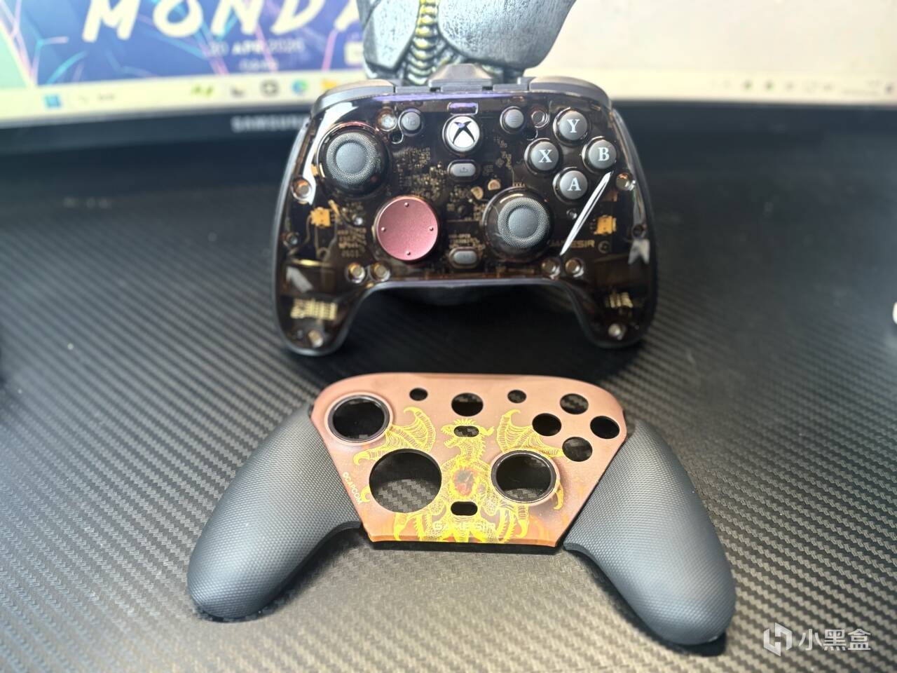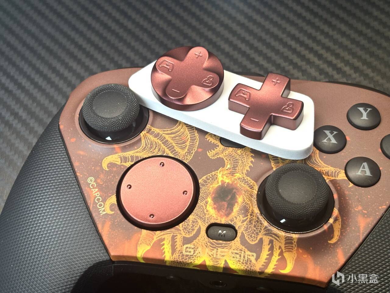 先來講講聯名的要素,這一次的聯名要素其實全部聚集在主面殼處,兩側的握把並沒有聯名細節,而主面殼處是一條噴火的巨龍,說實話,搭配上手柄整體的暗紅色調。真的很帥!而且依舊是可拆卸的磁吸面殼設計,也算是當下手柄的標配了,拆下之後,其實能夠看到,裏面的透明保護殼,也是暗紅色的色調。小細節這一塊,小雞你贏了。