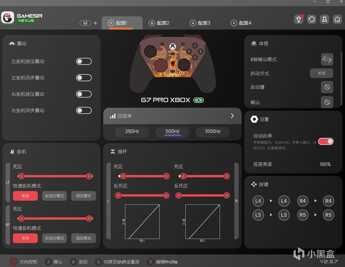 在驅動方面,則是GameSir Nexus可以直接在微軟商店找到。 在裏面可以開啓體感映射模式,在此之前的微軟手柄,都是沒有體感的,微軟也因此飽受詬病,小雞的G7 Pro則是真的做到了PC端強制開啓體感映射模式。其實我感覺這是一次很好的創新,用它去玩一些射擊遊戲的時候,是真的舒服,同時它支持回報率的選擇,以及各種功能調節。