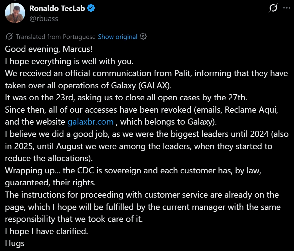 负责巴西地区影驰业务运营的TecLab公司人员罗纳尔多·布萨利(Ronaldo Buassali)表示,当地团队于4月23日收到了同德的官方通知。据布萨利称,所有未完结的售后工单需在4月27日前处理完毕,在此之后,团队的邮箱、巴西消费者投诉平台Reclame Aqui账号以及影驰巴西官网的访问权限均被收回。