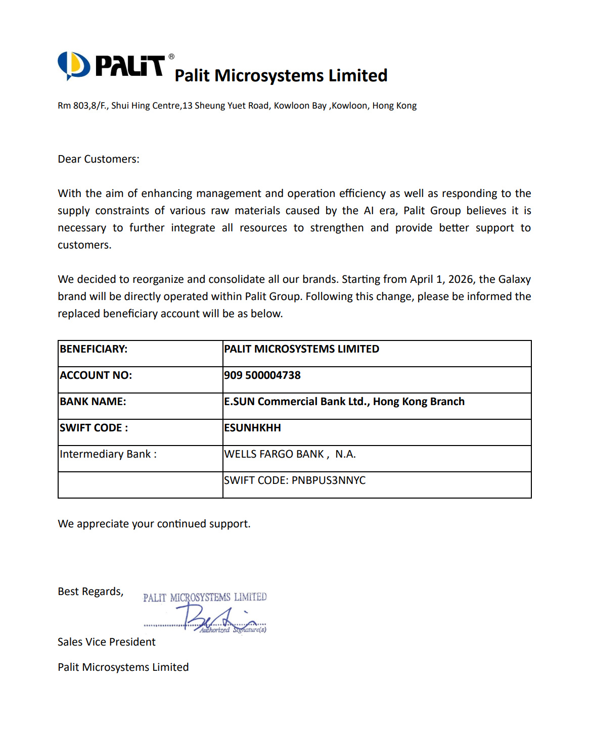 我司决定对旗下所有品牌进行重组与整合。本次调整自2026年4月1日起生效,届时影驰品牌将在同德集团体系内直接运营。本次调整后,收款账户信息变更如下,特此告知。