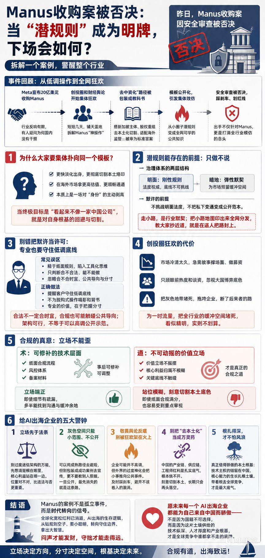 Manus的案例不是一个孤立事件,它更像是时代转向的信号。全球化的宽松红利已经消退,AI出海的生存逻辑,从早年的钻规则空子、耍小聪明,转向了守住边界、拿出大智慧。别用精巧的技术合规去遮掩立场上的摇摆,更别用短期的套利想法去挑战长期的治理逻辑。闷声才能发财,守拙才能走得远,这些老道理放到今天,依然管用。