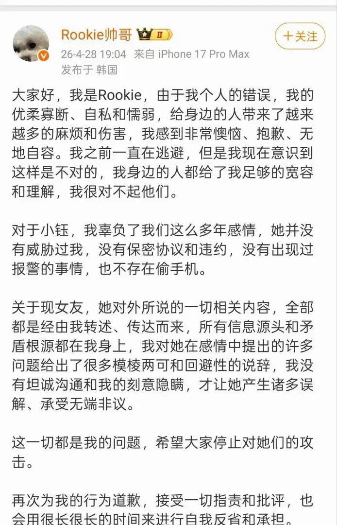 在这份致歉声明中,Rookie 没有辩解,没有甩锅,字字句句都在“自我认罪”。他坦言,自己因优柔寡断、自私懦弱,给身边人带来了无尽麻烦与伤害,满是懊恼与愧疚。他承认长期逃避问题,辜负了身边人的宽容。这份迟来的清醒,让不少围观网友感到意外。